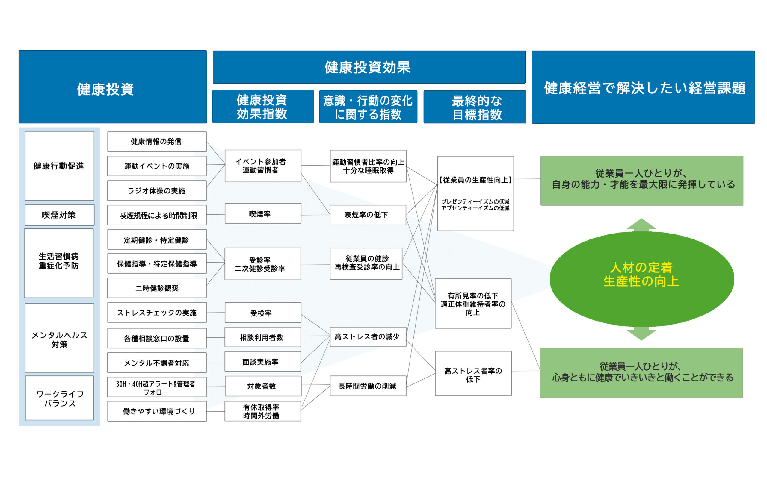 「戦略マップ」は、現在展開中の健康関連の「人的資本への投資」と「健康経営で解決したい最終目標」との繋がりを可視化したものです。